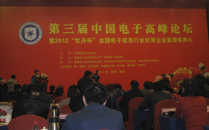 12月15日,由中國電子企業(yè)協(xié)會主辦的第三屆中國電子高峰論壇暨2012“牡丹杯”全國電子信息行業(yè)優(yōu)秀企業(yè)家頒獎典禮在河南洛陽舉行,公司總經(jīng)理王嵐保先生榮獲“全國電子信息行業(yè)優(yōu)秀企業(yè)家”稱號。該項榮譽是繼2011年榮獲全國電子信息行業(yè)最具潛力企業(yè)后,公司取得的又一殊榮。