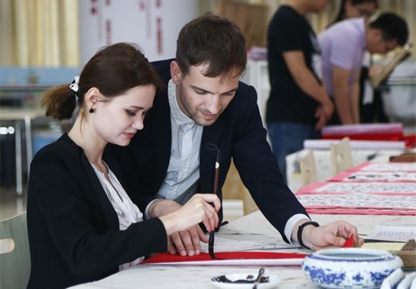5月12日,在山東省臨沂市拓普網(wǎng)絡(luò)股份有限公司書畫院,來自烏克蘭的瑪麗娜(左一)與男朋友亞歷山大一起練習中國書法。二人于2014年來到山東省臨沂市拓普網(wǎng)絡(luò)股份有限公司工作。