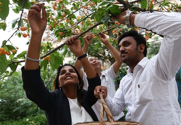 5月11日,在山東省臨沂經(jīng)濟技術(shù)開發(fā)區(qū)芝麻墩街道西朱汪社區(qū),維格尼斯(右)和妻子卡奧帕娜在采摘櫻桃。二人于2015年來到臨沂市拓普網(wǎng)絡(luò)股份有限公司工作。