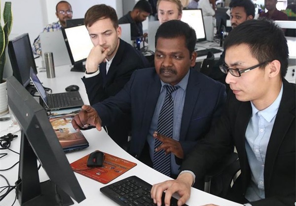 5月12日,在山東省臨沂市拓普網(wǎng)絡(luò)股份有限公司,巴布(右二)與中國同事張震超(右一)討論技術(shù)課題攻關(guān)。來自印度的巴布是計算機研發(fā)管理專家,2011年來到山東省臨沂市拓普網(wǎng)絡(luò)股份有限公司工作。