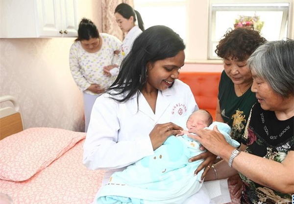 5月12日,在山東省臨沂市第三人民醫(yī)院,婦產(chǎn)科醫(yī)生墨賓(左三)與新出生的嬰兒瑞瑞及其家人在一起。她的丈夫巴布是計算機研發(fā)管理專家,2011年來到山東省臨沂市拓普網(wǎng)絡(luò)股份有限公司工作,2016年墨賓帶著女兒來到臨沂定居。