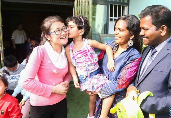 5月12日,在山東省臨沂經(jīng)濟技術(shù)開發(fā)區(qū)協(xié)和幼兒園,5歲的印度小朋友黛芬娜(右三)親吻老師。她的父親巴布(右一)是計算機研發(fā)管理專家,2011年來到山東省臨沂市拓普網(wǎng)絡(luò)股份有限公司工作,2016年黛芬娜隨母親墨賓(右二)來到臨沂定居。 為積極融入“一帶一路”戰(zhàn)略,位于山東省臨沂市經(jīng)濟技術(shù)開發(fā)區(qū)的國家中印科技國際創(chuàng)新園引進印度、烏克蘭、俄羅斯、捷克等國家的高層次人才,開展云計算、大數(shù)據(jù)、軟件技術(shù)、智能機器人、傳感器等領(lǐng)域的專業(yè)研究,這些因項目合作而結(jié)緣臨沂的外國專家,如今已融入當?shù)?,在臨沂展開了自己的幸福生活。新華社發(fā)(尹召功 攝) |