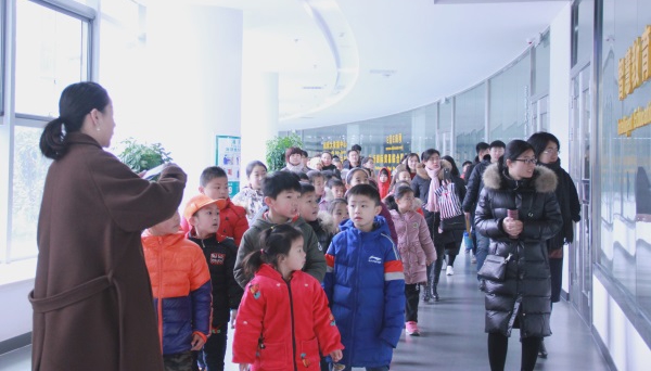 工作人員講解公司概況 在公司大樓的一樓展廳,講解員認(rèn)真講解公司概況、發(fā)展歷程,孩子們更是聽得全神貫注?!拔业陌职衷谘邪l(fā)部”“我的媽媽在教育云營(yíng)銷部”,聽完講解后,孩子們對(duì)爸爸媽媽們的工作有了進(jìn)一步了解。