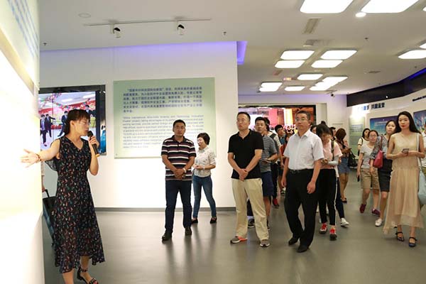 (記者團(tuán)參觀園區(qū)展廳) 據(jù)了解,此次活動(dòng)共有來自人民日報(bào)、新華社、求是雜志社、光明日報(bào)社、經(jīng)濟(jì)日報(bào)社、中央人民廣播電臺(tái)、中央電視臺(tái)、中國國際廣播電臺(tái)、中國日報(bào)社、工人日報(bào)社等36家媒體的42名編輯參加。