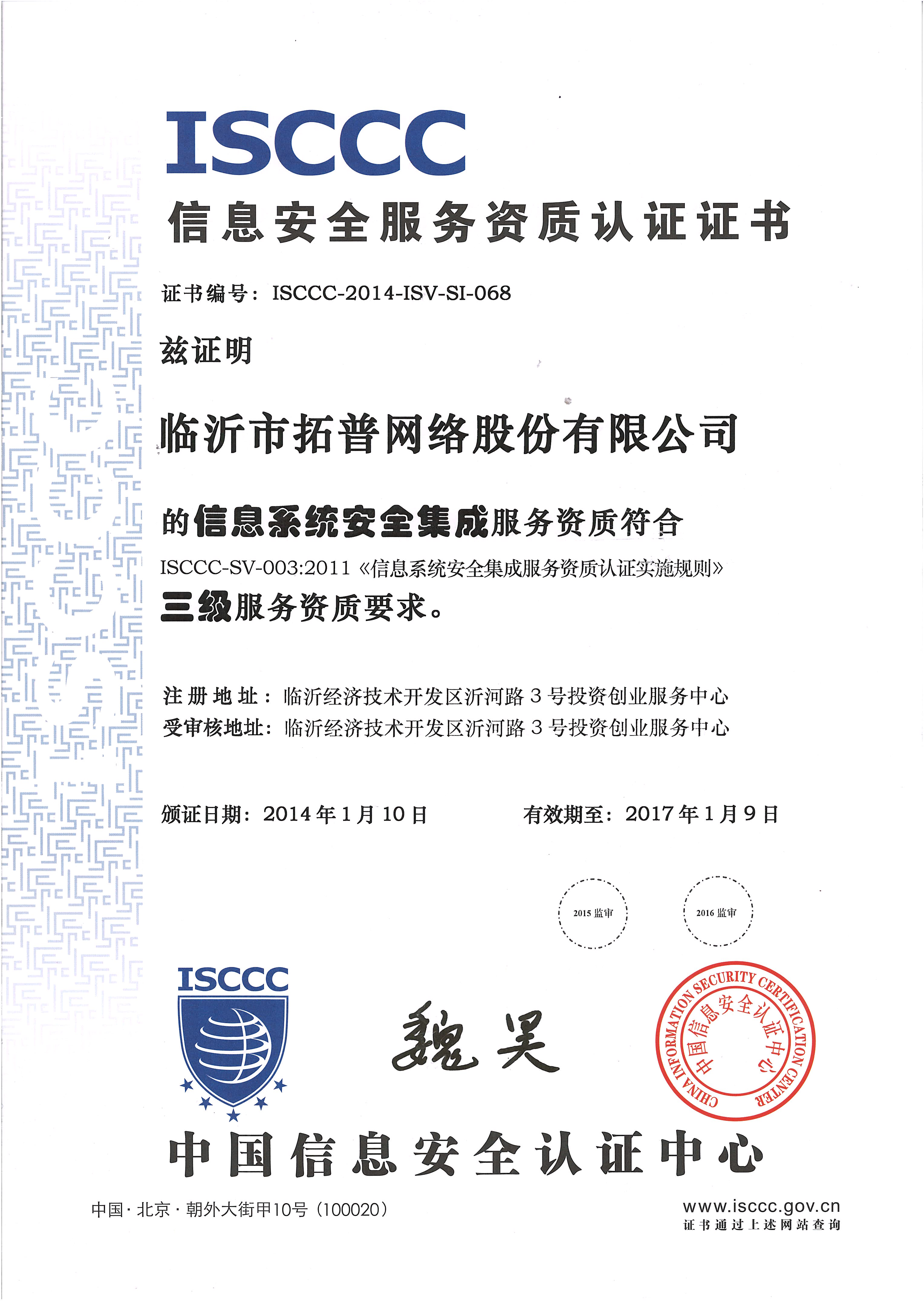 日前,公司的“信息系統(tǒng)安全集成”服務(wù)資質(zhì)系順利通過中國信息安全認(rèn)證中心多重嚴(yán)格測試檢查,正式取得由中國信息安全認(rèn)證中心頒發(fā)的ISCCC信息安全產(chǎn)品認(rèn)證證書,成為獲得國家權(quán)威機(jī)構(gòu)認(rèn)證的信息安全審計產(chǎn)品,標(biāo)志著公司服務(wù)資質(zhì)符合ISCCC-SV-003:2011《信息系統(tǒng)安全集成服務(wù)資質(zhì)認(rèn)證實施規(guī)則》三級服務(wù)資質(zhì)要求。
